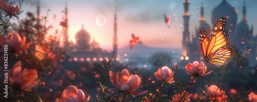 © 9DIGITECH, Fototapeta premium Dreamy Mosque Under Starry Indigo and Purple Cosmic Sky with Clouds.