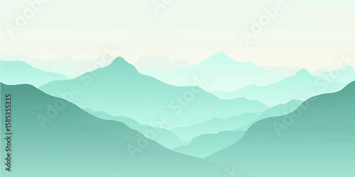 © Ashraful, Naklejka premium Dreamy Mountain View in Light Green Haze and Subtle Fog Layers with Minimalist Style
