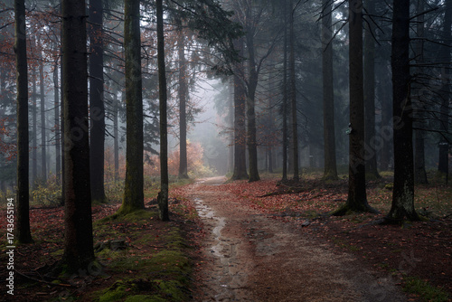 © Thilo Wagner, Naklejka premium Dreamy mystical forest covered in fog and mist with orange autumn leaves and enchanted trees in a peaceful moody woodland landscape