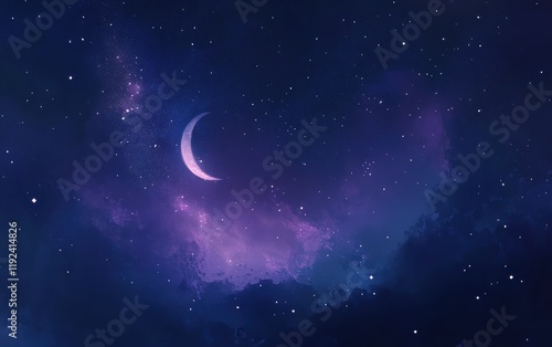 Fototapeta premium Dreamy Night Sky with Crescent Moon and Sparkling Stars on Purple Nebula...