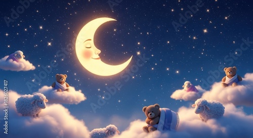Naklejka premium Dreamy nighttime landscape with crescent moon, fluffy clouds, and adorable teddy bears and sheep