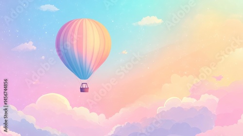 Fototapeta premium Dreamy pastel hot air balloon floating in magical cotton candy sky background with place for text