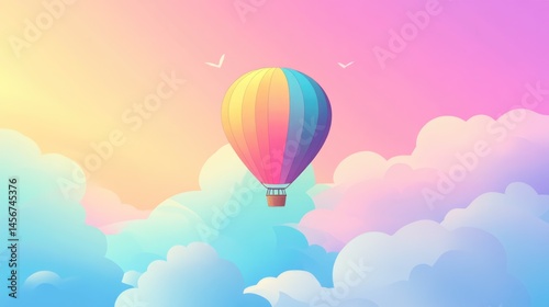 Fototapeta premium Dreamy pastel hot air balloon floating in magical cotton candy sky background...