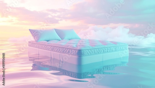 © Jimy, Naklejka premium Dreamy Pastel Mattress Floating on Serene Water under Gradient Sky