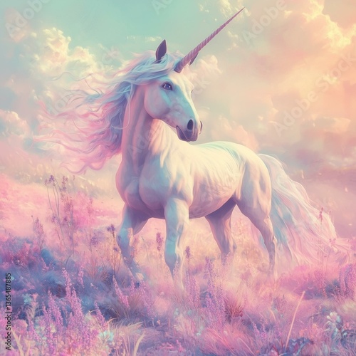 © pikul, Fototapeta premium Dreamy Pastel Unicorn in an Enchanted Fantasy Meadow | Fantasy Pastel Art & Ethereal Mythological Creature