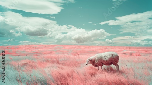 © Nakarin, Fototapeta premium Dreamy Sheep: Surreal Infrared Landscape with Vibrant Grazing Flock