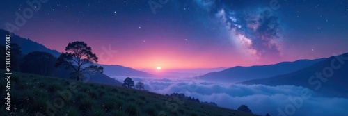 Fototapeta premium Dreamy starry landscape with misty atmosphere and subtle sparkles,...
