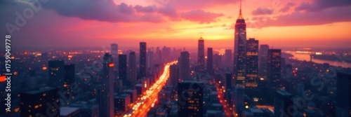 © Wanwipa, Obraz premium Dreamy Sunset Cityscape Blurred Urban Skyline Background for Websites and Design Projects