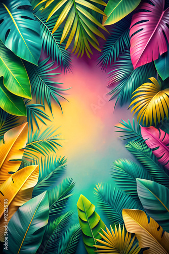 © fr_119, Fototapeta premium Dreamy Tropical Background. Vibrant Leaves on a Pink, Yellow, and Teal Gradient.