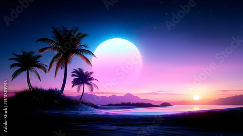 © MZR, Naklejka premium Dreamy Vaporwave Sunset Landscape with Glowing Palm Trees