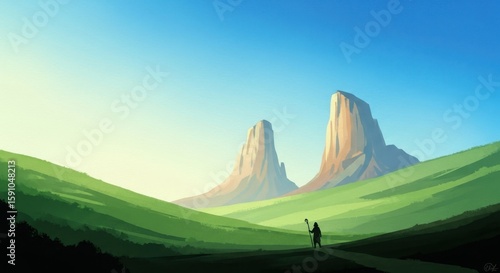© Johsna, Fototapeta premium Dreamy vista featuring rolling green hills and distant rocky mountains under a bright blue sky creates a calm atmosphere.