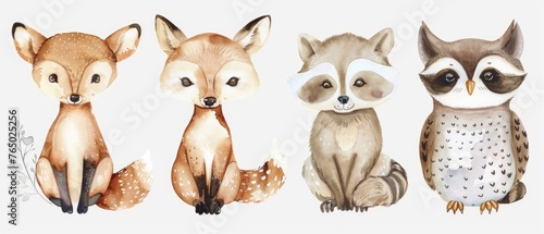 Naklejka premium Dreamy watercolor clipart collection, picturing a fluffy baby fox, a soft-spotted deer, a clever raccoon, and a twinkling-eyed owl, each set against white.