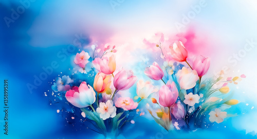 © YiuCheung, Obraz premium Dreamy watercolor floral art featuring pink and white tulips with soft petals blooming against a vibrant blue and pink backdrop.