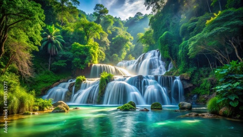 Obraz premium Dreamy waterfall cascades into a vibrant tropical forest, a double exposure...