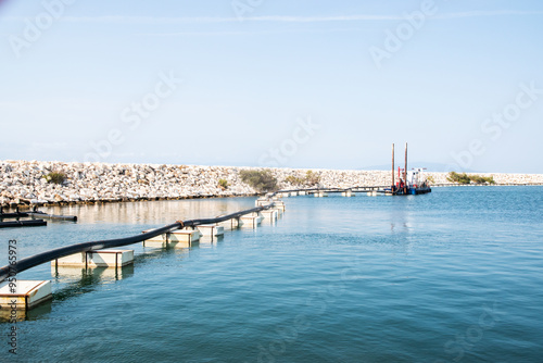 Fototapeta premium Dredger ship in Mediterranean port on sunny summer day