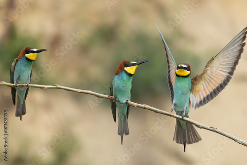 © Aloisia, Fototapeta premium drei Bienenfresser auf einem Ast, einer davon gerade bei der Landung