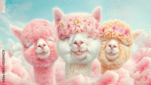 Obraz premium Drei niedliche Alpakas in Pastellfarben mit Blumenkranz in verträumter Wolkenlandschaft