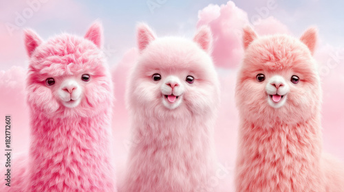 Naklejka premium Drei süße Alpakas in zarten Pastellfarben vor rosafarbener Wolkenkulisse mit fröhlichem Ausdruck
