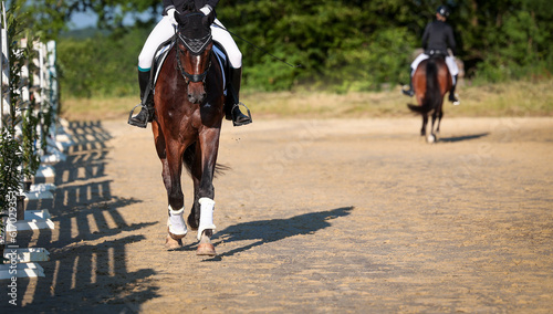 Obraz premium Dressage horse with rider photographed from the front at a trot, in the background another rider in the blur..