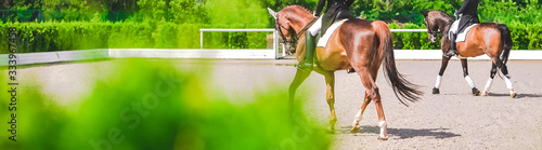 Obraz premium Dressage horses and riders in black uniform. Horizontal banner for website...