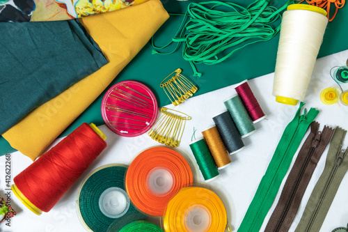 Fototapeta premium Dressmaker's workspace. Professional sewing material. Table with fabrics, elastic, safety pins, buttons, ribbons, zips, threads and needles. Top view