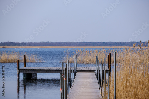 © Martins Vanags, Naklejka premium drewniana deska ścieżka podnóża trampolina w jeziorze