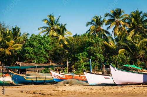 © bortnikau, Fototapeta premium Drewniane łodzie rybackie na plaży Morjim, North Goa, Indie