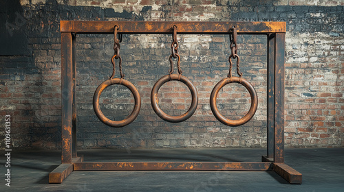 Naklejka premium Drewniane pierścienie do ćwiczeń zamontowane na masywnej, stalowej ramie,...