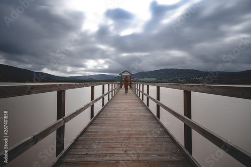© Andrey, Fototapeta premium Drewniany most przez jezioro w pochmurny dzień długi czas ekspozycji