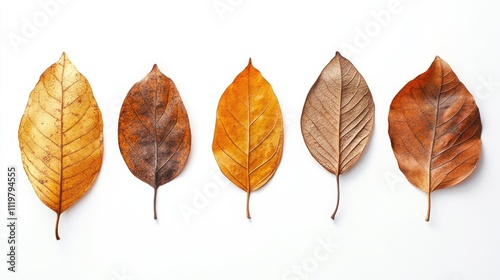 Fototapeta premium Dried autumn leaves in various shades arranged on a clean white background showcasing texture and color transition.