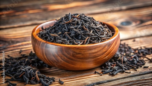 Fototapeta premium Dried black tea leaves in a wooden bowl, wooden, traditional, wooden,...