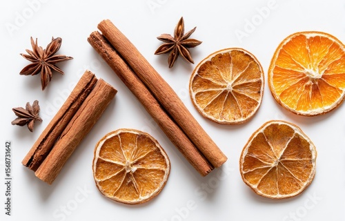 © Sukardi, Fototapeta premium Dried citrus slices, cinnamon sticks, and star anise