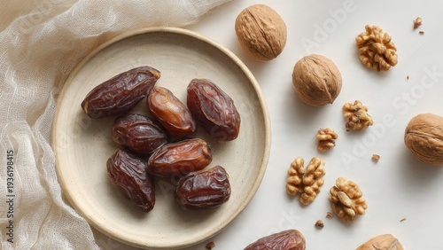 © Andre Jovi, Obraz premium Dried dates and walnuts on a ceramic plate flat lay background
