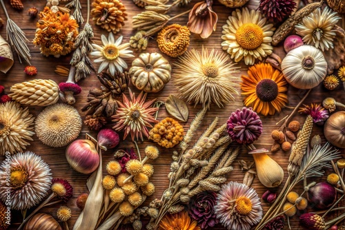 Fototapeta premium Dried flower arrangement on rustic wooden background