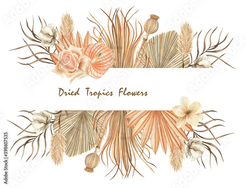 Fototapeta premium Dried Flowers Tropics Frame Watercolor Illustration Tropical Leaves Wedding Invitations Boho Style