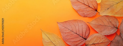 © Seyyar, Obraz premium Dried gradient leaves on vibrant orange background showcasing botanical art with ample space for text and design elements