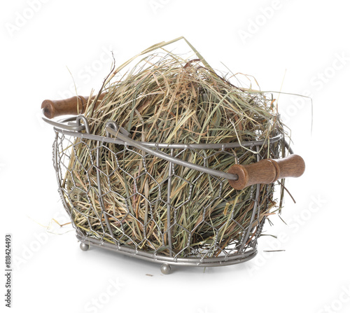 Obraz premium Dried hay in metal basket isolated on white