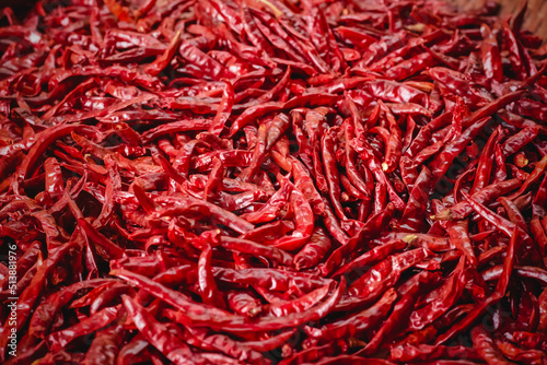 © Pornthep, Fototapeta premium Dried hot chillis background. Close up of dried red chili.