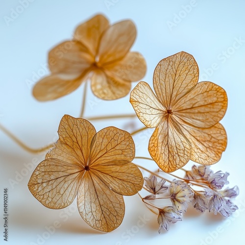 © Andrei, Fototapeta premium Dried Hydrangea Flowers, Delicate Floral Pattern on White Background, Tan and Brown, Natures Beauty