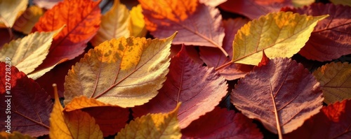 © dadtophoto, Fototapeta premium Dried leaves with warm colors in loose scattered, texture, dry leaves
