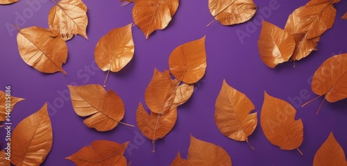 © Prayad, Obraz premium Dried orange metallic leaves, violet backdrop Geometric autumnal design , fall, decor, stock photo