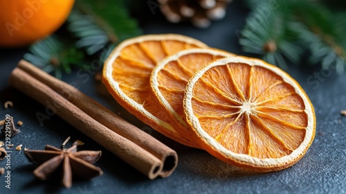 Fototapeta premium Dried Orange Slices with Cinnamon Sticks and Spices on a Dark Background for Holiday Decor