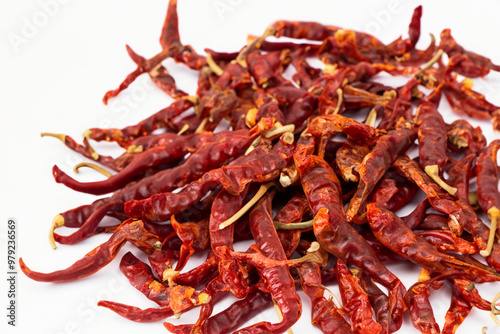 Fototapeta premium Dried peppers on white with a smoky tan color. Garlic above organic concept. Red and red peppers with a green and dried tomatoes in a jar. A white with dried peppers, red peppers, and onions red.