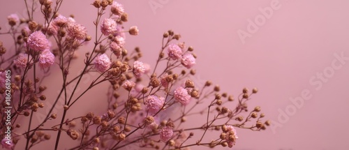© yenart, Fototapeta premium Dried pink flowers arrangement against pastel pink background