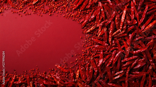 © Keopaserth, Naklejka premium Dried red chili peppers scattered on vibrant red background create striking visual. rich color and texture evoke sense of warmth and spice, perfect for culinary themes
