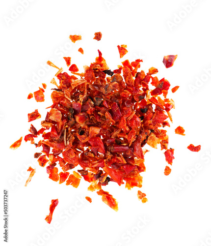 © vandycandy, Naklejka premium Dried red paprika flakes isolated on white background. Spices and herbs. Top view.