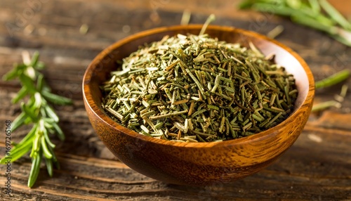 Fototapeta premium Dried rosemary in a wooden bowl on a rustic surface
