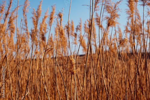 Fototapeta premium dried rush in the wind with blue sky