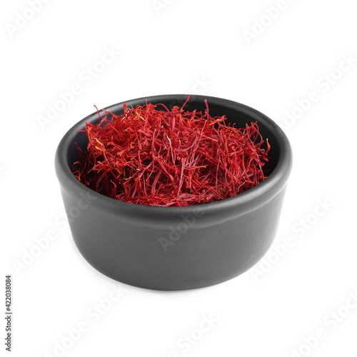 © New Africa, Fototapeta premium Dried saffron in bowl isolated on white