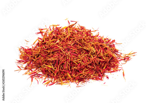 © nata777_7, Naklejka premium Dried saffron spice isolated on white background.